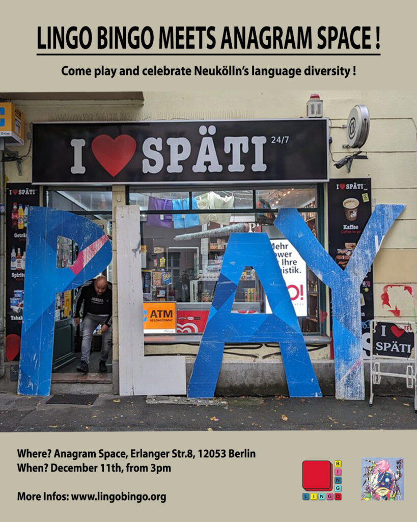 Come and celebrate Neukölln’s language diversity with fun and games. Lingo Bingo performs at the Anagram book shop on december 11th from 3pm onwards !
